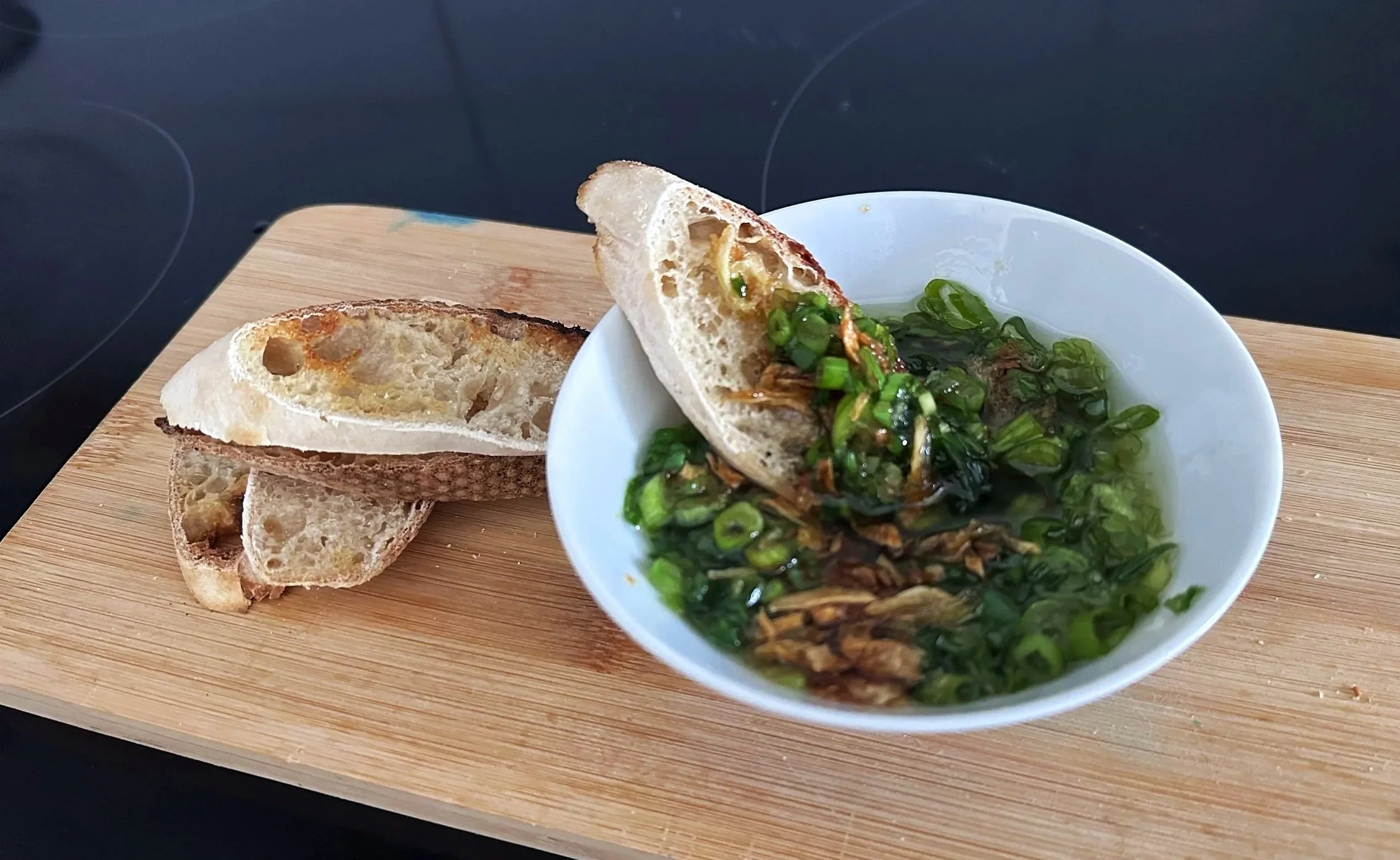 When the bread becomes a little stale the next day, we don’t throw it away. Instead, we toast it until the crust becomes crisp again and the inside warms up. Then we drizzle it generously with our homemade green onion sauce.