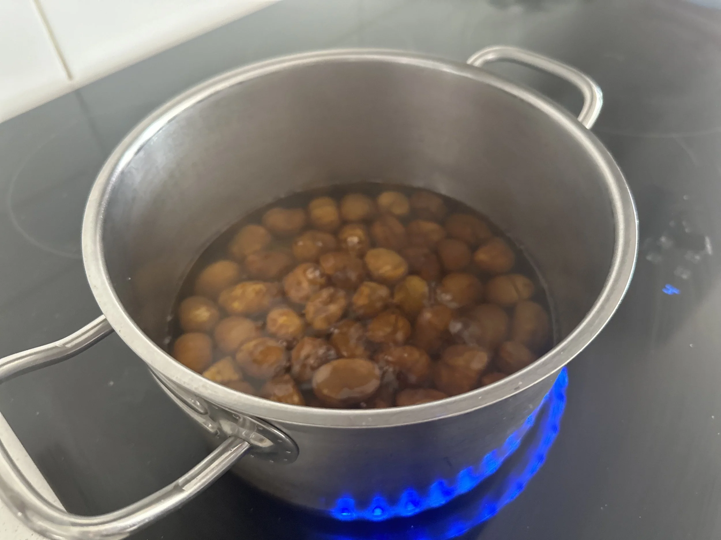 The next day (or after several hours), bring the syrup and chestnuts back to a gentle simmer for another 5–10 minutes.