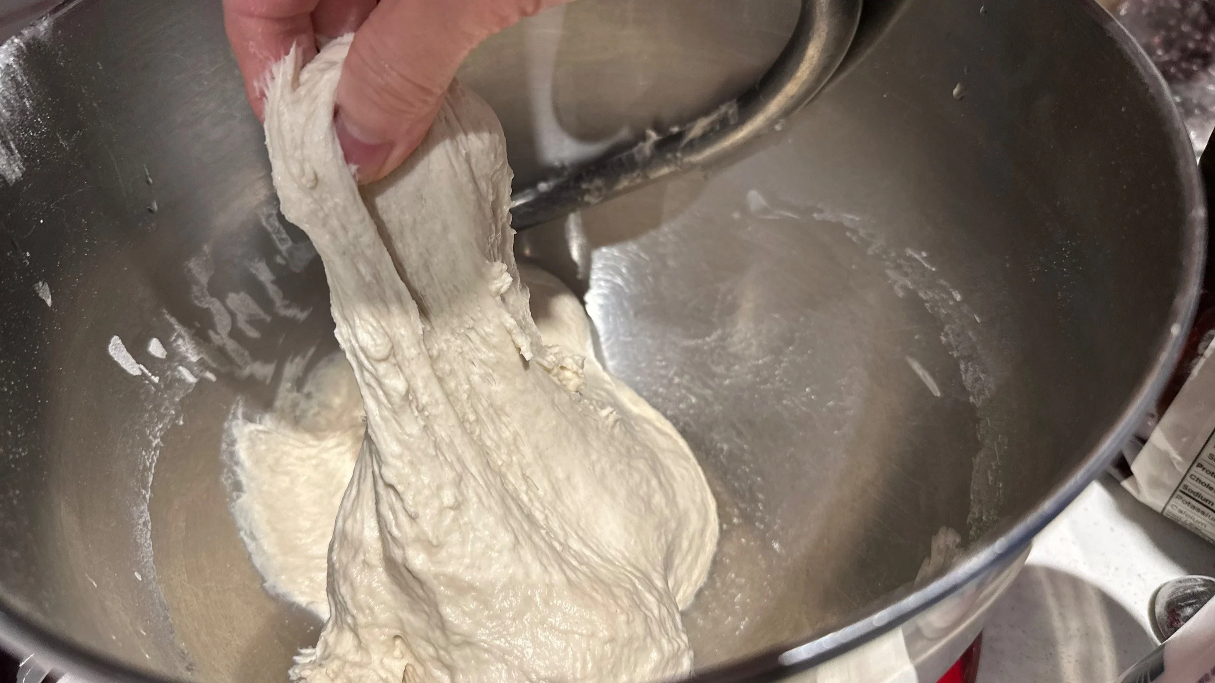 When dough forms and pulls together, remove hook, cover with plastic wrap, and rest for 30 minutes. Then, mix dough again for 1-2 minutes to deflate, and rest for another 30 minutes.
