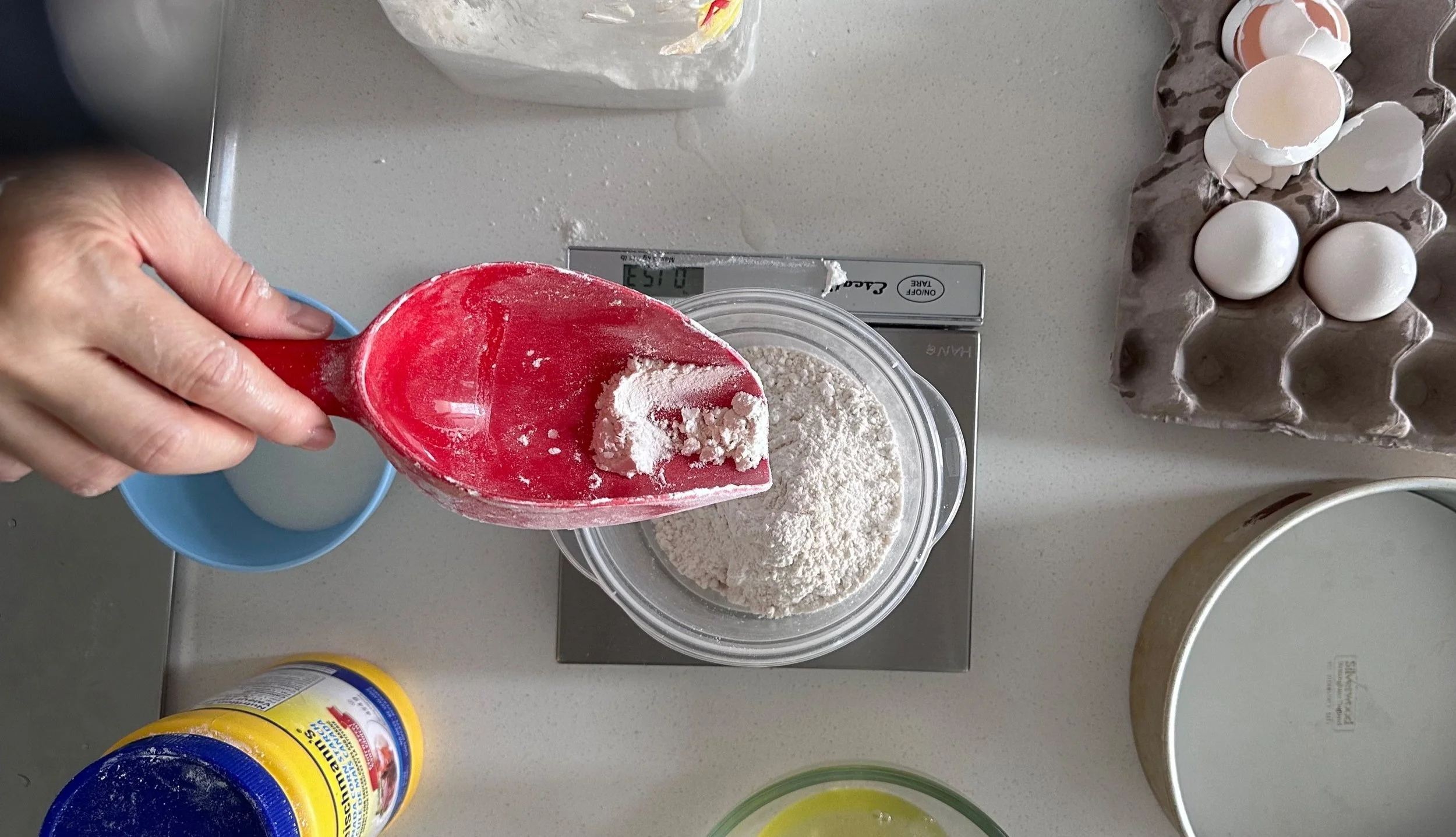 Combine the egg yolks, sugar, flour, and cornstarch, then fold in the egg white meringue in three additions.