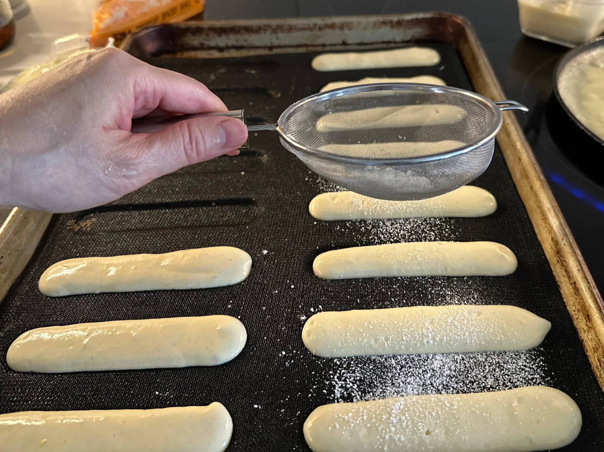 This recipe makes one round 8-inch cake pan and 12 ladyfinger cookies for decoration.