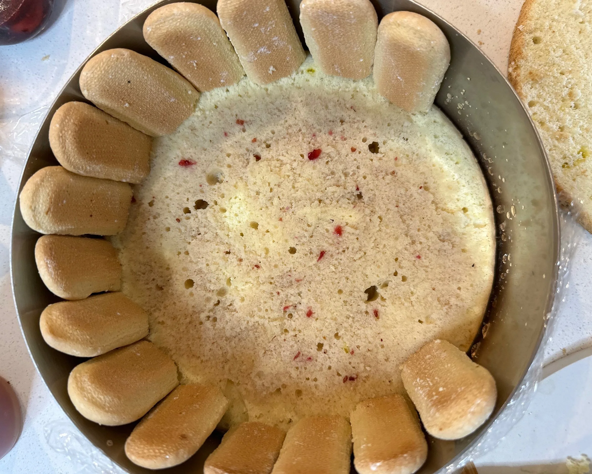 Slice the sponge into 2 layers and use one layer for the base. Use a cake ring with acetate, arrange ladyfingers around it, and insert the sponge to hold the base in place. Use the berries juice soaking the sponge