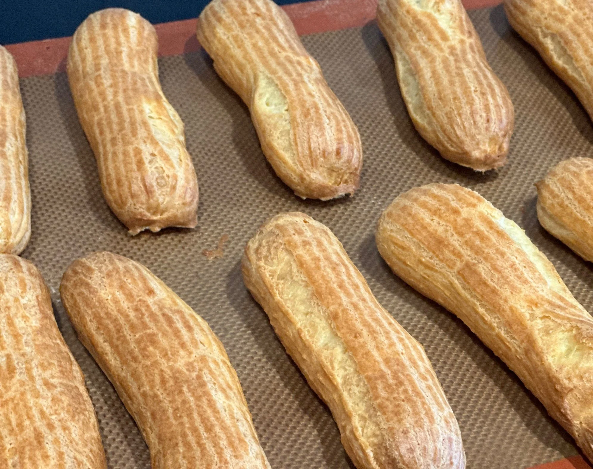 Pipe the éclair pastry dough into 4-inch long eclairs. Only squeeze once at the beginning as you pipe each éclair. Don’t add any more pressure after the initial squeeze. This will make about 12 pieces of 4-inch size long.