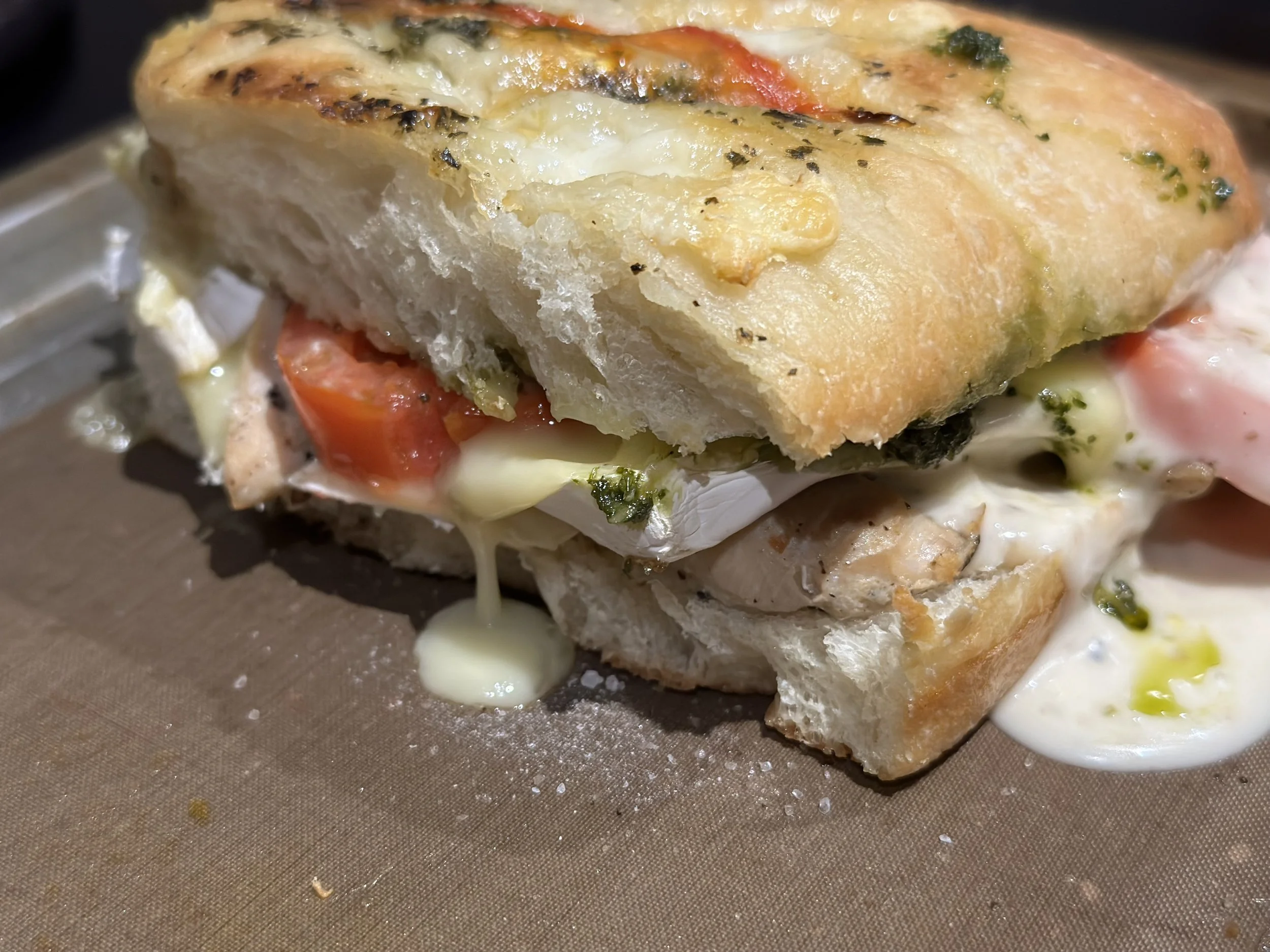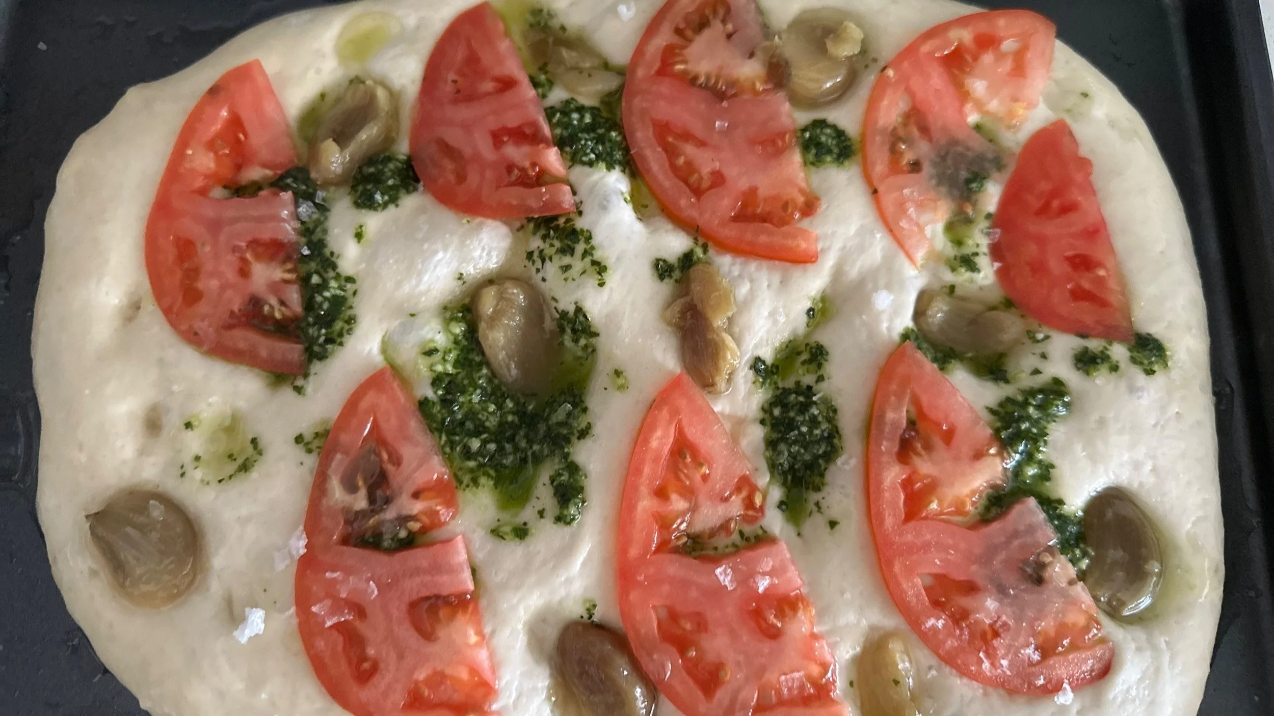 Focaccia baked with tomatoes, roast garlic, pesto basil