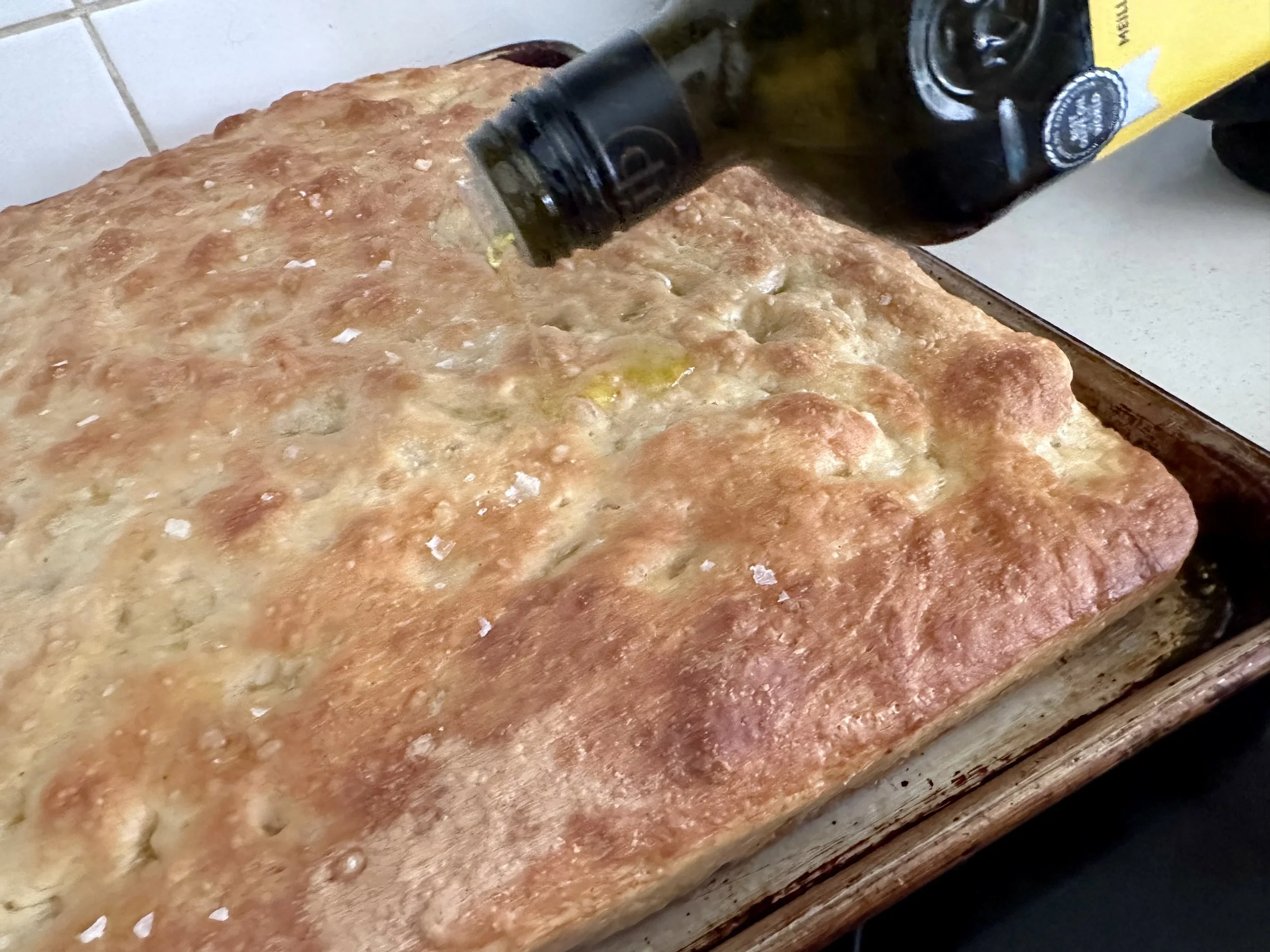 After the initial rest, transfer the dough to a well-oiled sheet pan. Gently stretch and press the dough to fit the pan, being careful not to deflate the bubbles that have formed during fermentation. Cover the pan with a damp cloth and let the dough rise for another hour or so, until it has doubled in size.