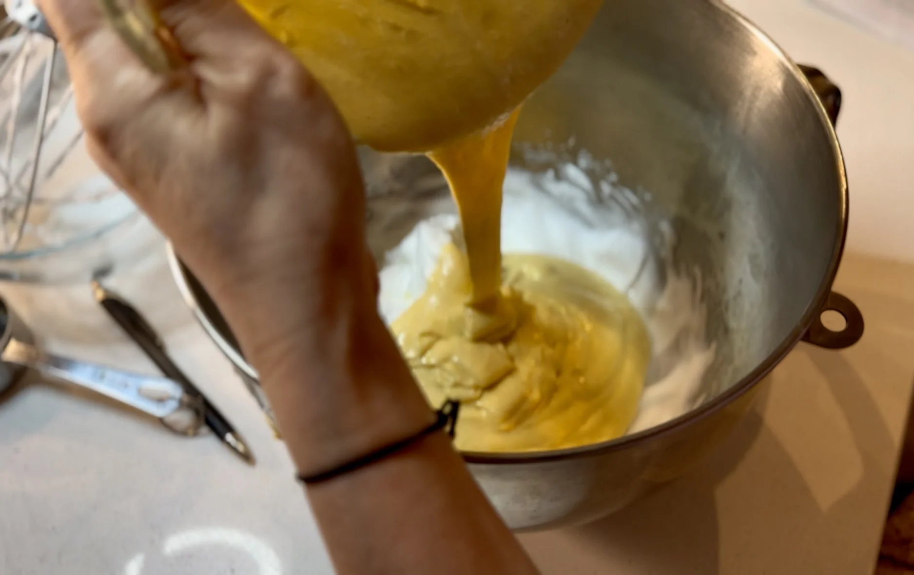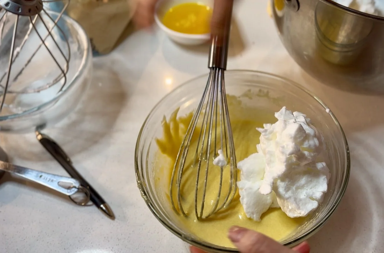 After folding the egg whites and egg yolk mixture, pour the yolk mixture into the remaining egg whites.