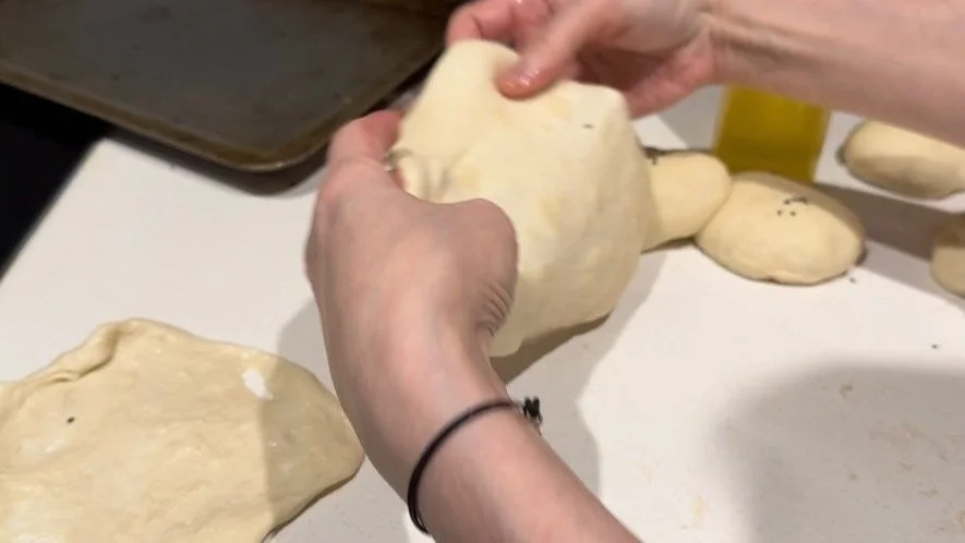 4. Preheat a skillet. Use a rolling pin or your hands to flatten each dough out to 1/4 inch thick. Toast the flattened dough on the smokey skillet on both sides.