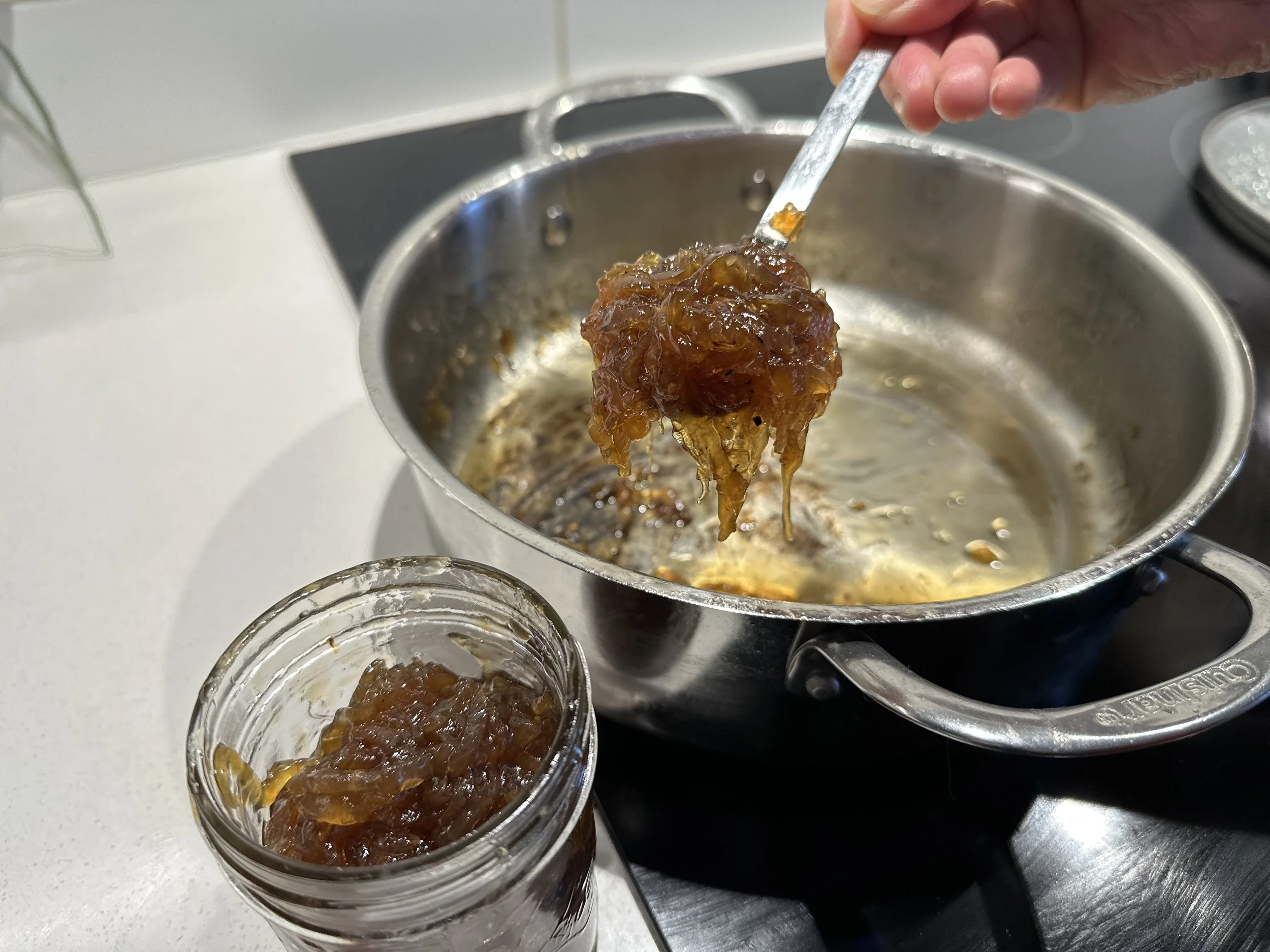 After cooling for 4 hours, simmer the onions again on low for 20 minutes to thicken and translucent. Remove the thyme and transfer the onions to a jar for refrigeration.