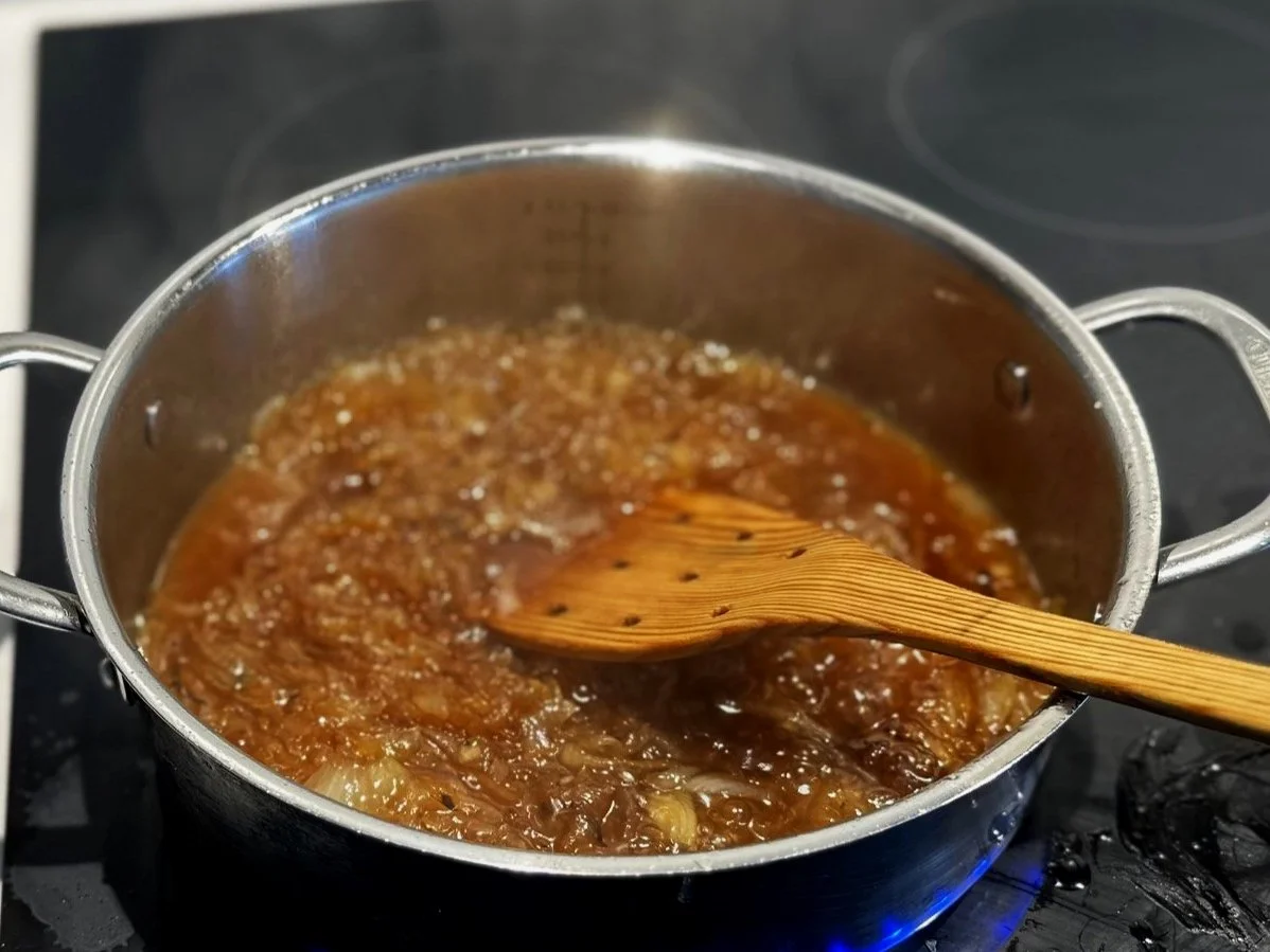 A symphony of flavors unfolds as 200ml of vinegar joins the melange. Harmonizing 100ml of exquisite white balsamic vinegar with 100ml of aged cherry vinegar, gently incorporate this elixir into the alluring amalgamation of onions. A dance of fragrances intoxicates the senses as the onions bask in the exquisite ratio of a sugar-to-vinegar symphony, wherein equality reigns supreme. The onions, inherently nature's sweetness, necessitate no more sugar than this divine proportion. Adding the thyme and bay leaves, allowing the protagonist, 1 teaspoon of sea salt, to make a grand entrance. Unleashing its power, the salt fortifies the meticulously concocted blend, coaxing out its full potential. With a symphony of sizzling heat, allow the reduction process to work its magic for a further ten minutes, coaxing the voluptuous juices to diminish. Witness as the vivacious mixture undergoes a mesmerizing transformation, defying expectations. While the onions might not reach the zenith of their brilliance, nor adorn themselves in transparency just yet, quell your impatience. It is time for the onions to retire, gradually cooling and basking in their glory for a couple of hours. Their beauty lies in patience, for in due time, they shall dazzle with sheer translucence, ensnaring hearts with their sticky, amber caramel embrace.
