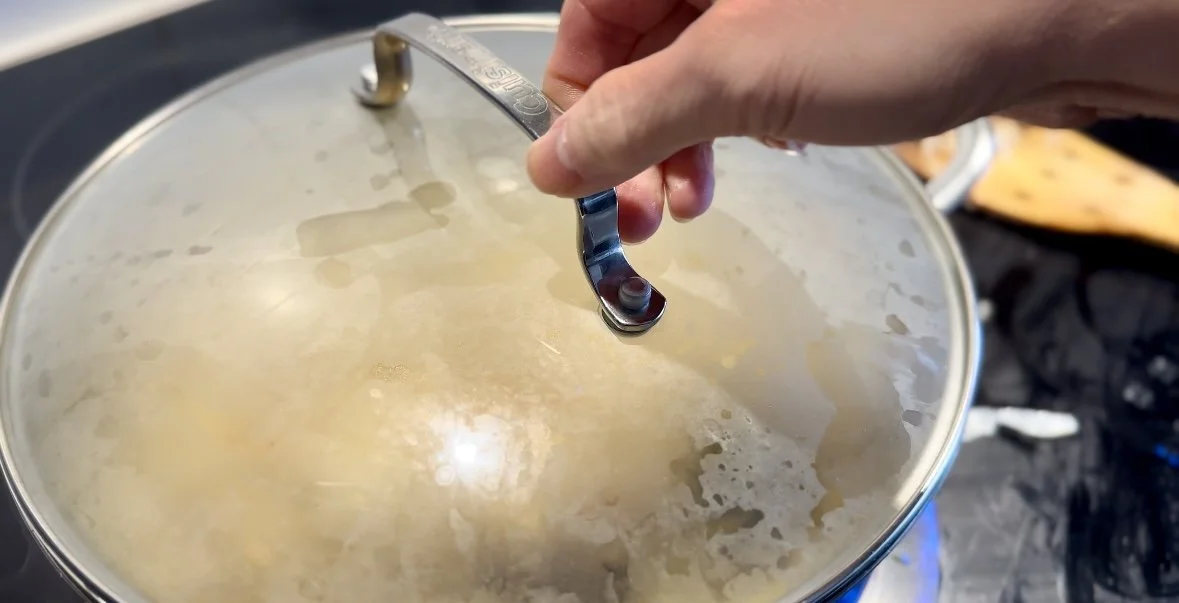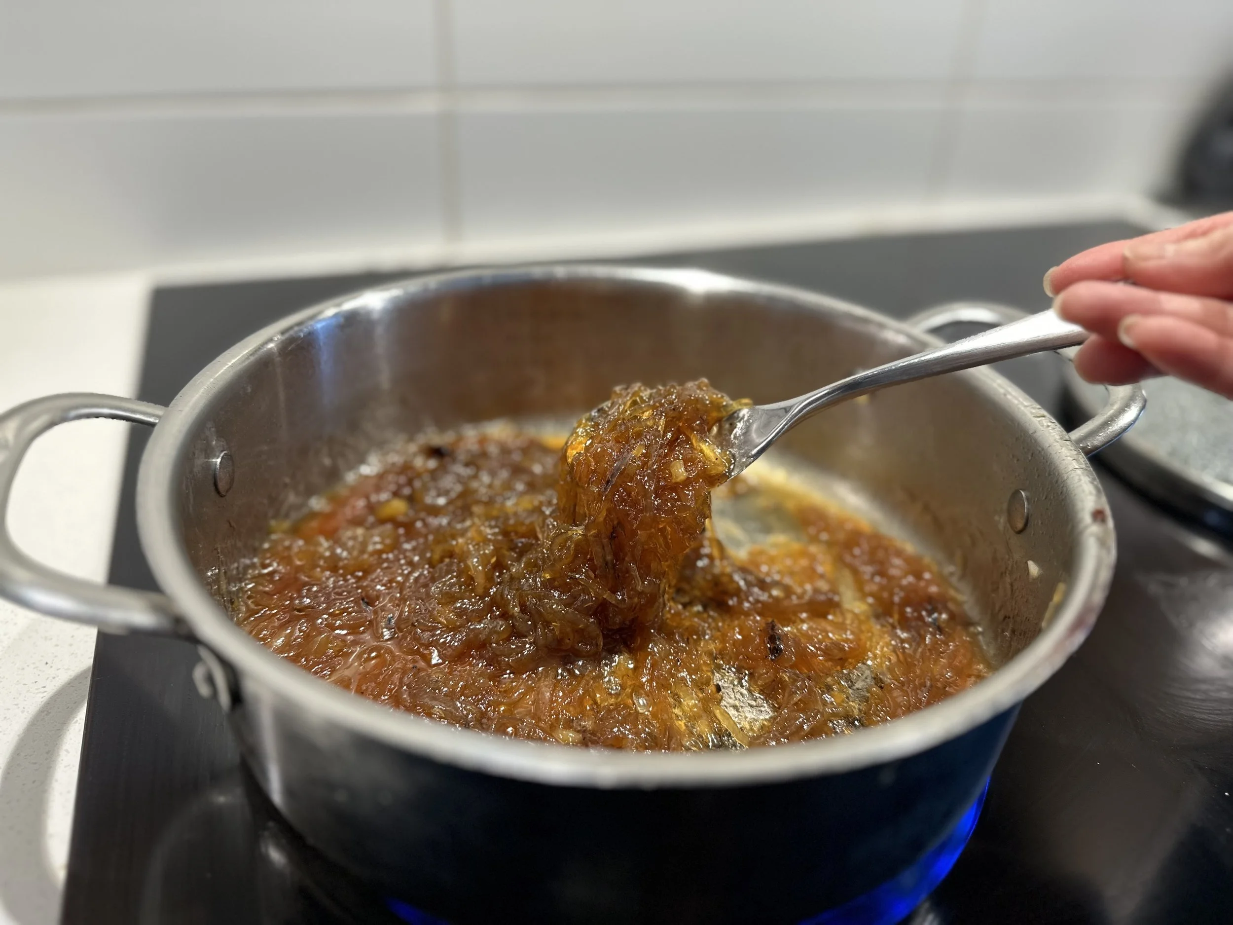 Slice the onions into thin slices or chunks, then cook them on low with the lid on until softened and caramelized.