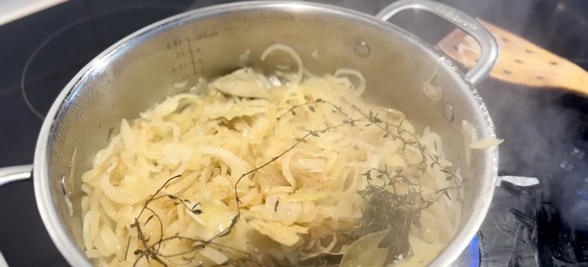 Embarking on this culinary adventure, gather five luscious yellow onions. Begin by delicately slicing them into paper-thin quarter-inch pieces, or if you so desire, dicing them into smaller, more refined morsels. In a spacious pot, luxuriate in one tablespoon of olive oil melding with another tablespoon of butter. As the heavenly aroma infuses the air, gracefully introduce the meticulously prepared onions and, on a gentle flame, stir them artfully. Immerse a few sprigs of aromatic thyme and bay leaves into the mix. Serenade the lid as it envelops the pot, allowing the onions to languish and caramelize for a tantalizing ten minutes.