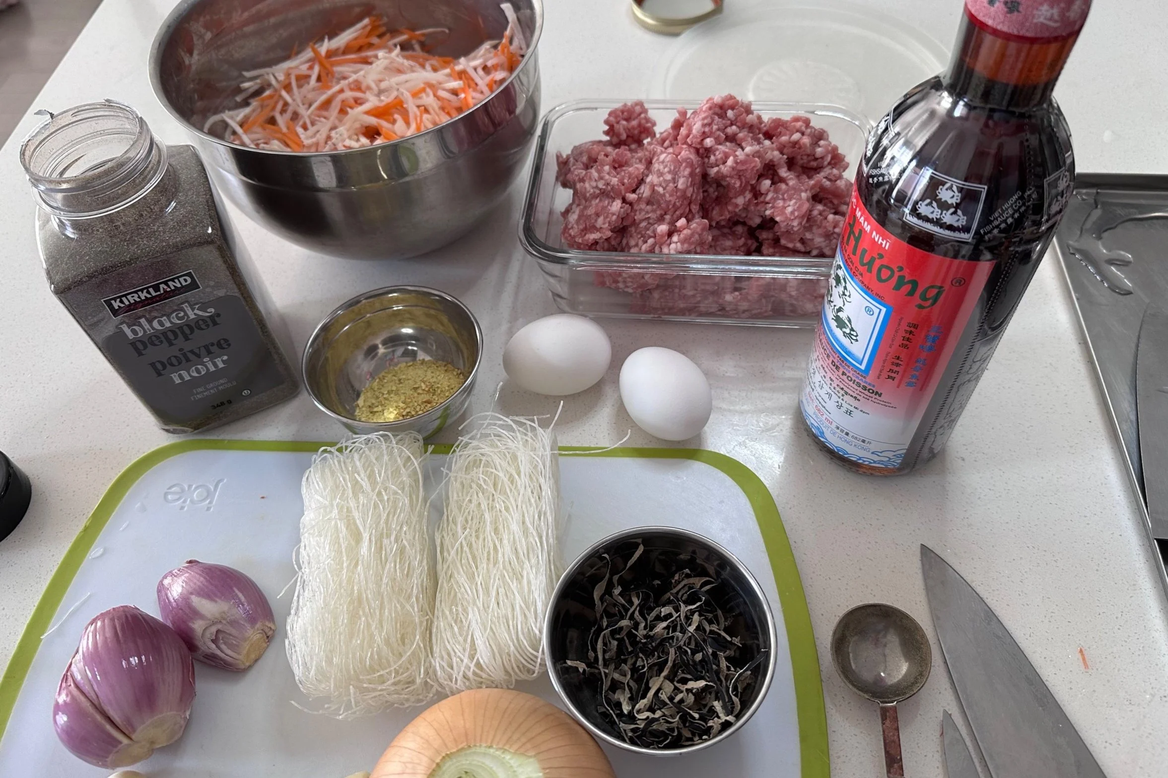 Add the chopped onions, shallots and crush garlics into the bowl of shredded vegetable. Adding 2 tbsp ground black pepper, I Like lot a black pepper in the ground pork but you can use 1 tbsp only or less if it too spicy for you but don’t’ skip, black pepper work very well with pork. In go the meat and 3 tbsp Fish sauce this will give the spring rolls a nice umami flavor when it cooked, it’ s not Smell like raw fish sauce at all, very nice when they fried. I use the three crabs brand, if you use different brands use 2 tablespoon of fish sauce only and always taste before wrapping it, from scoop a little bit of the filling cook in microwave and try it to adjudge the taste (by adding more fish sauce or less or more instant powder if you want to use less fish sauce Continuing adding 2 Eggs, wood ear mushroom, cut the glass noodle shorter (clear vermicelli) easy to mix.