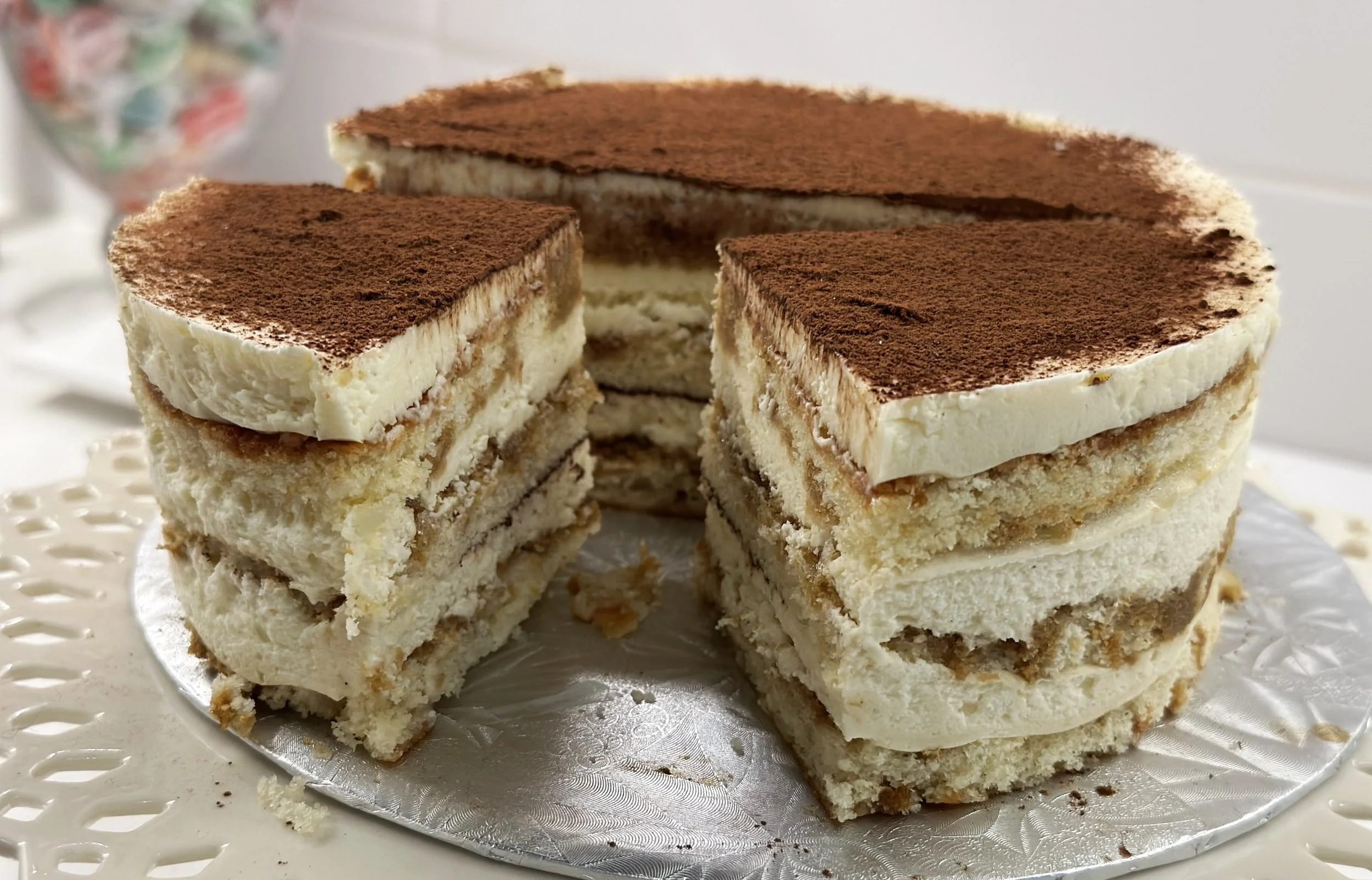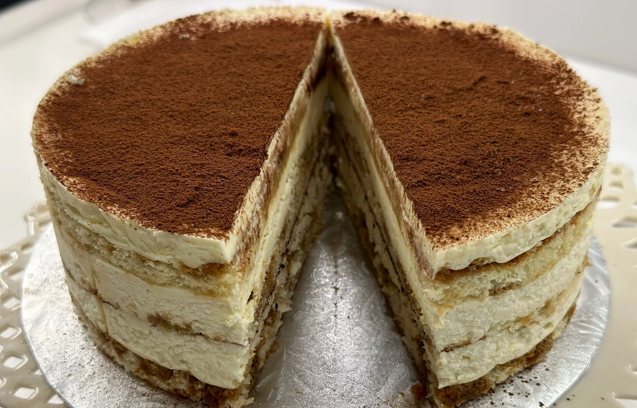 Slice the cake into three layers. Place the first layer at the bottom of the cake and saturate it with coffee. Apply the mascarpone cream, spreading it evenly, and sprinkle with cocoa powder. Repeat the process for the remaining layers, finishing with a sprinkle of cocoa powder on top, then refrigerate to set before serving chilled.