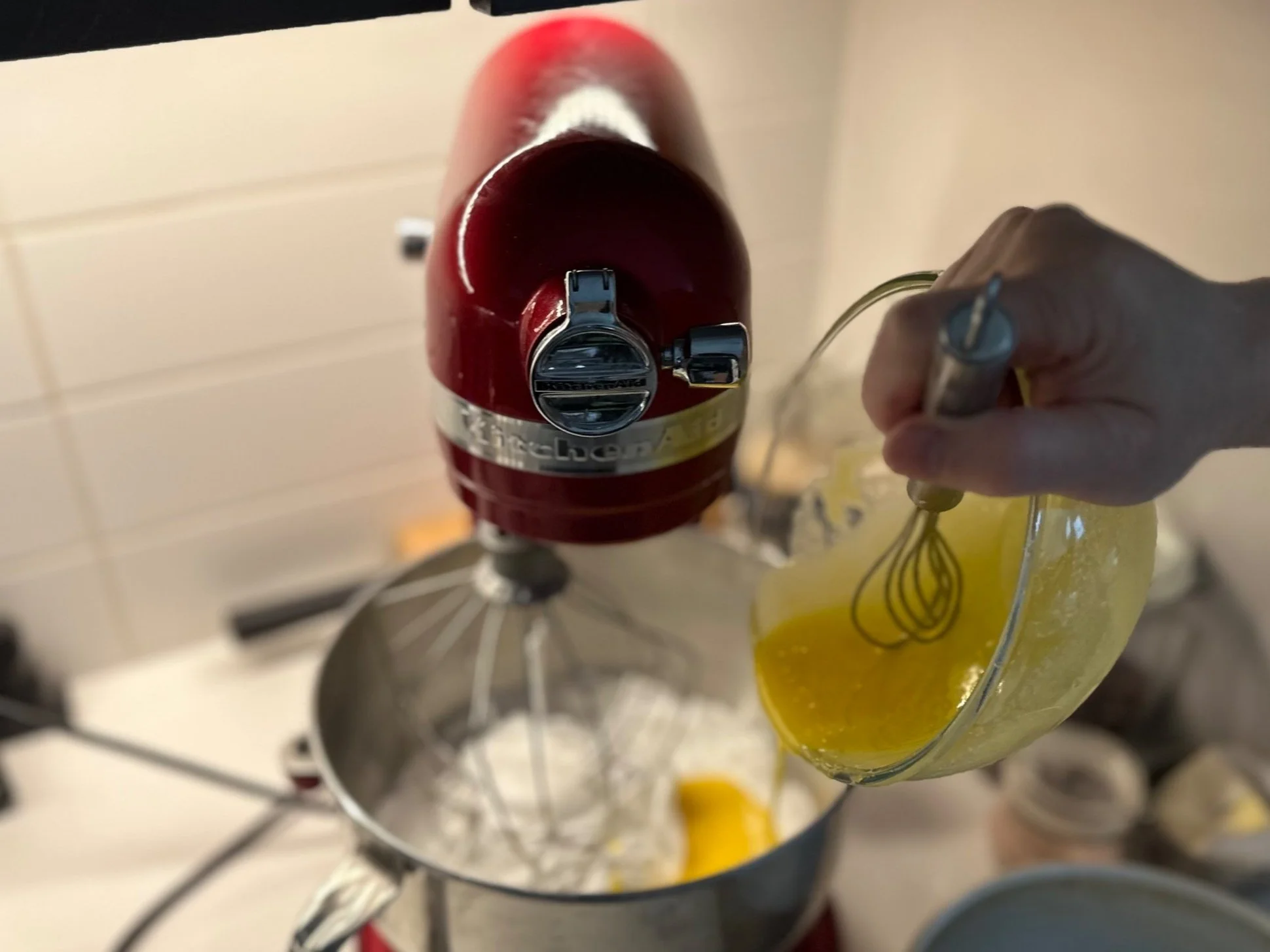 5. Fold the egg yolk mixture into the egg white mixture (soft stiff peaks/meringue).