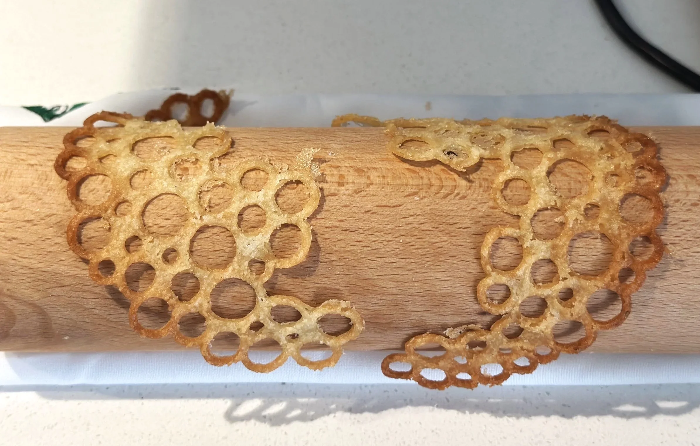 Working quickly, use a spatula to lift each cookie and drape it over a rolling pin, bottle, or curved mold to form the signature curved shape.