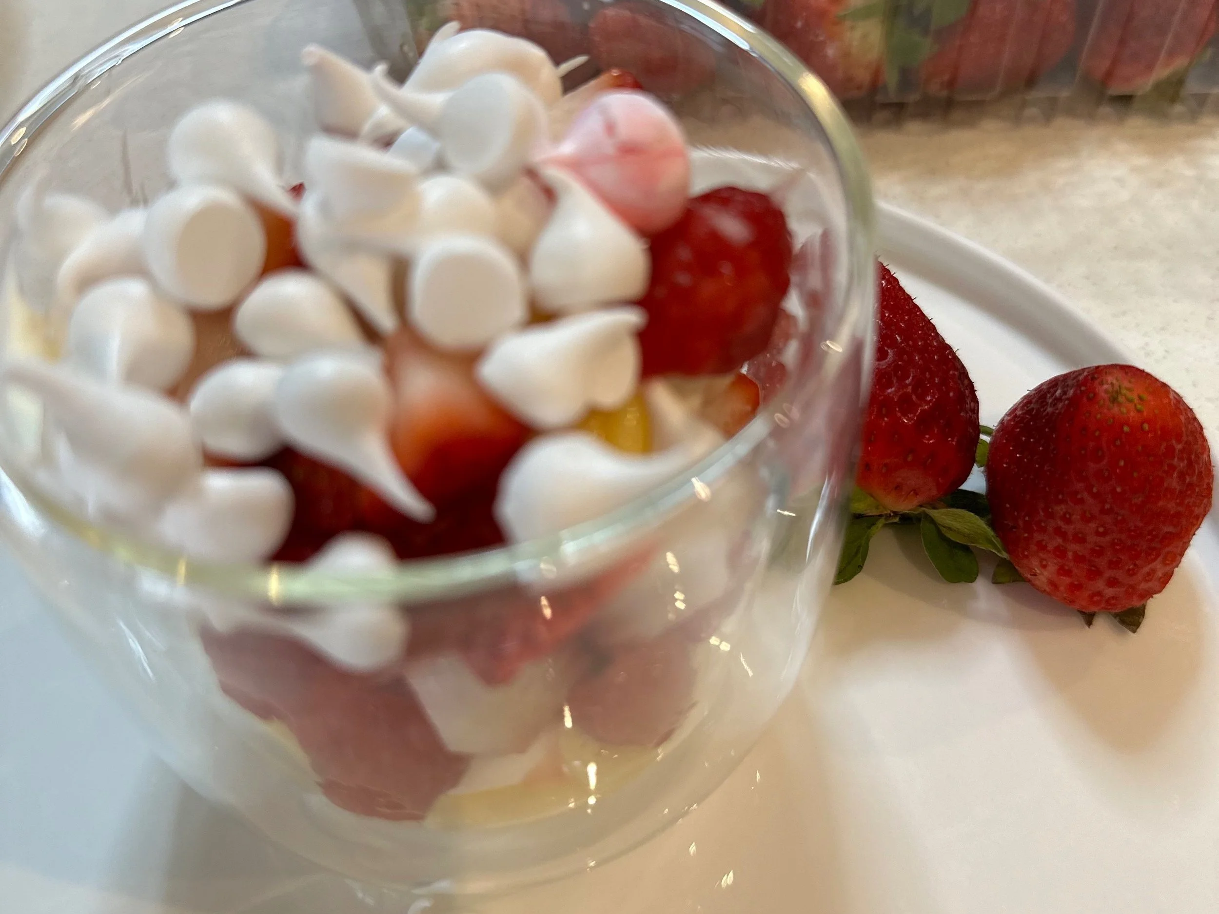 White chocolate mousse and lemon curd with fresh berries and mini meringue kiss